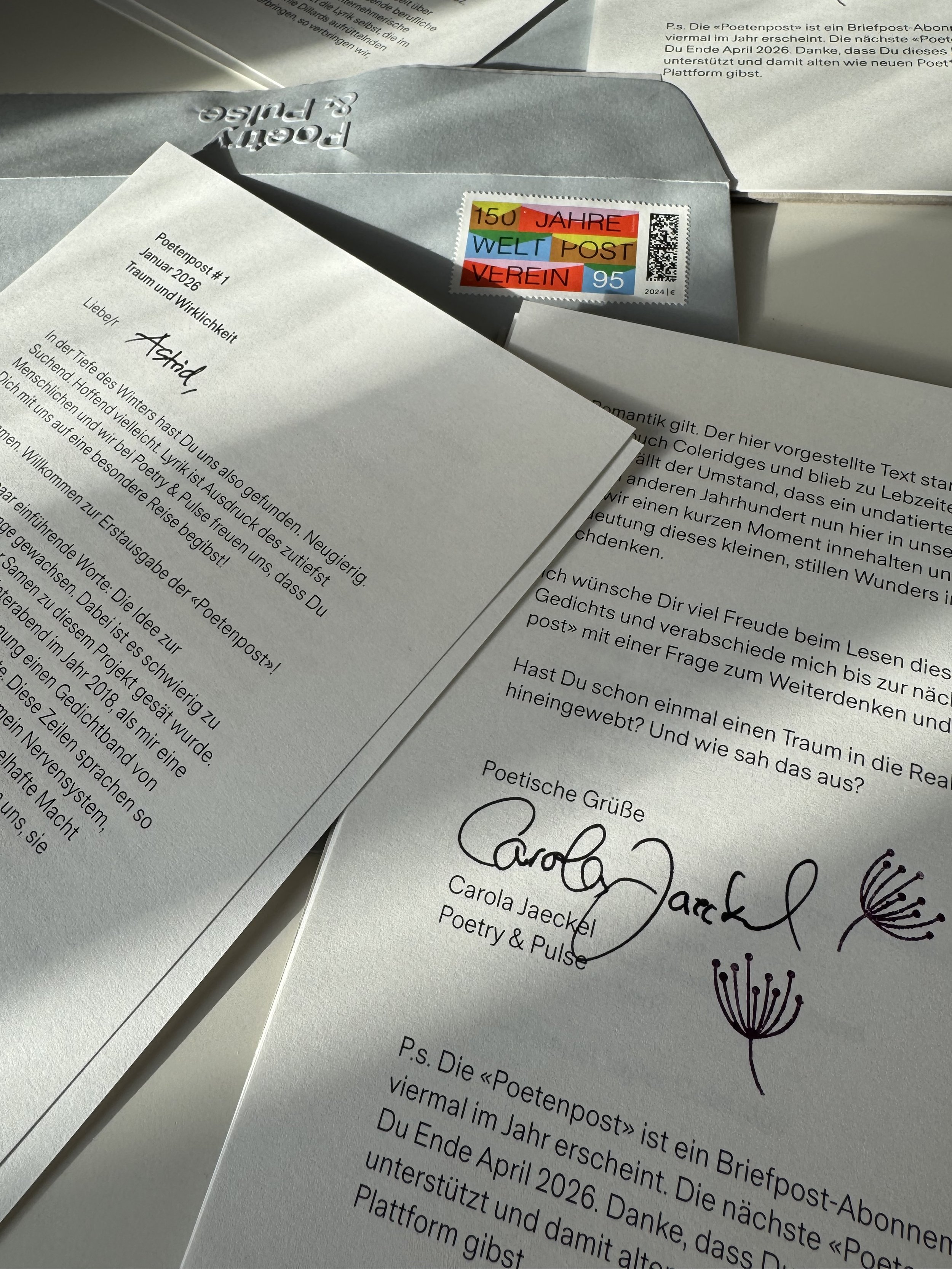 Mit einem Abonnement unserer «Poetenpost» erhältst du 4x/Jahr besondere Post in deinen Briefkasten und damit Zugang zu alten und neuen Dichterstimmen und einer Community von Gleichgesinnten.